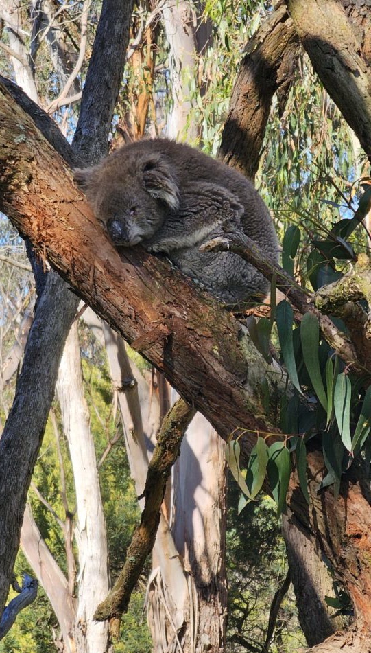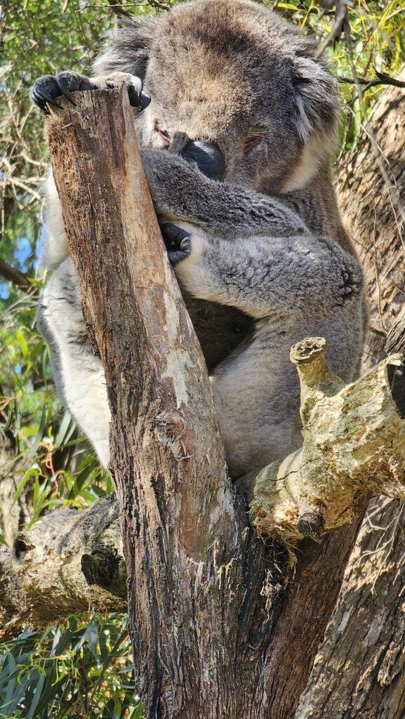 Bekanntlich verbringen Koalas ja den größten Teil des Tages schlafend oder dösend, und in den kurzen übrigen Zeiten bewegen sie sich auch äußerst sparsam, um Muskelenergie zu sparen.