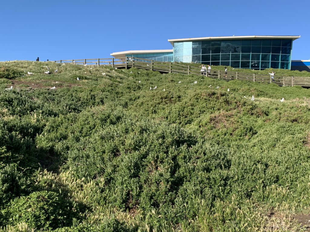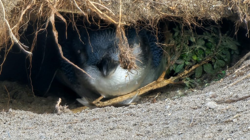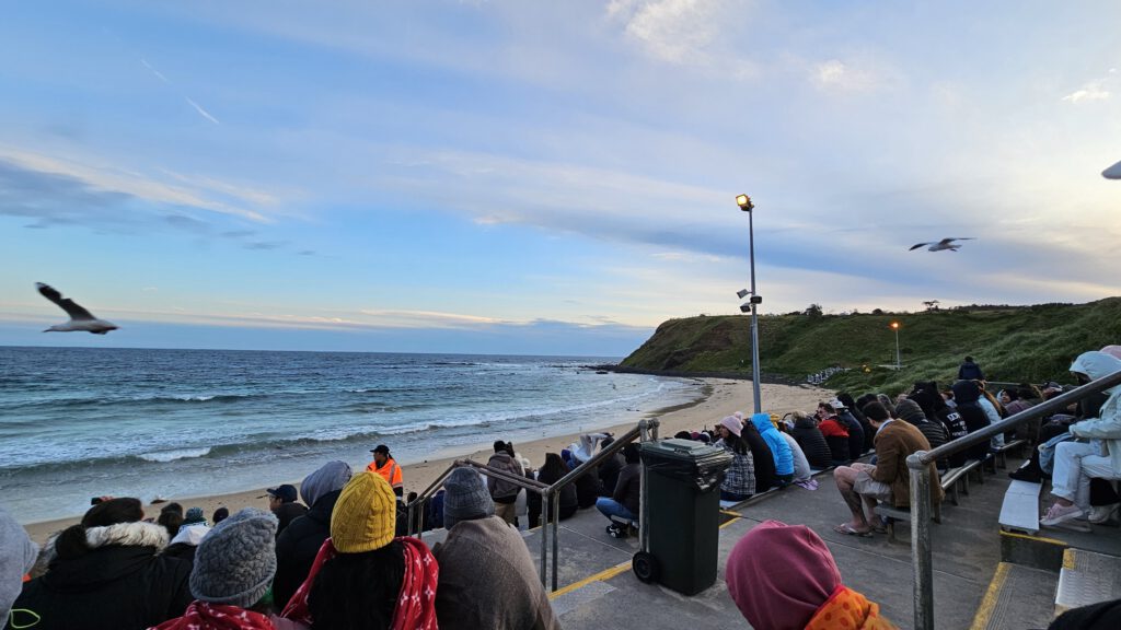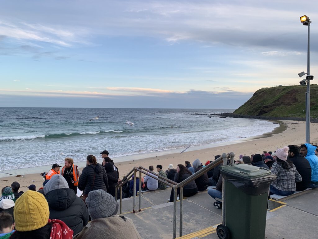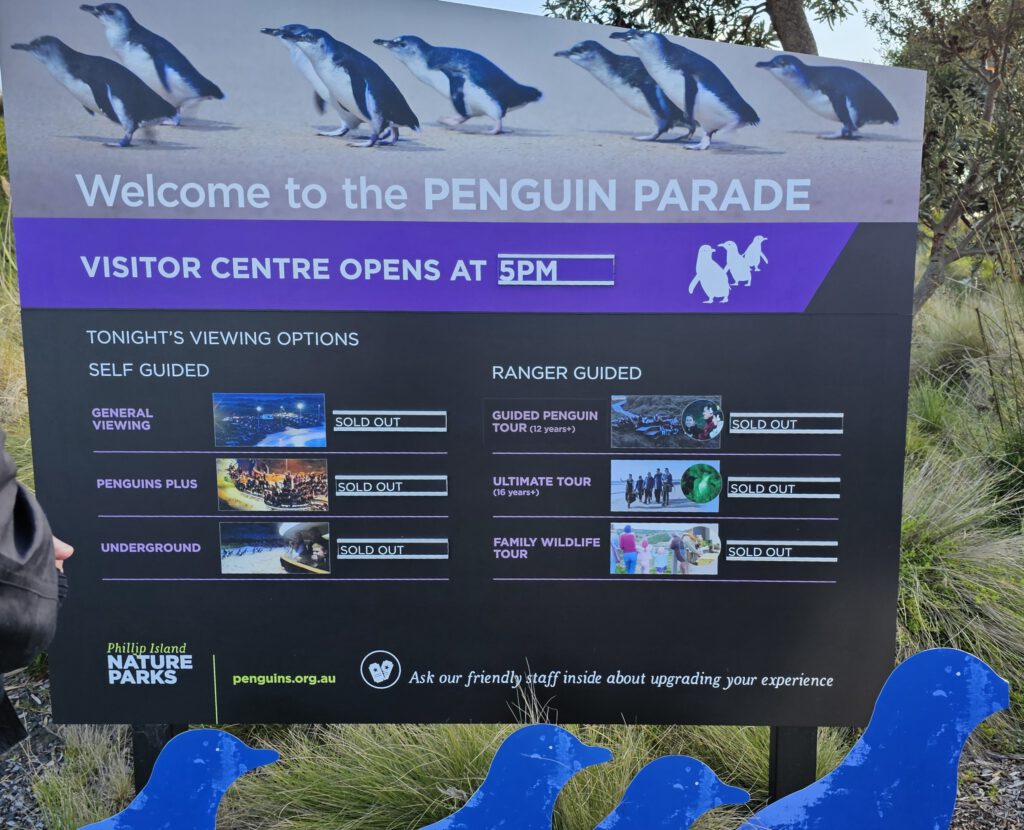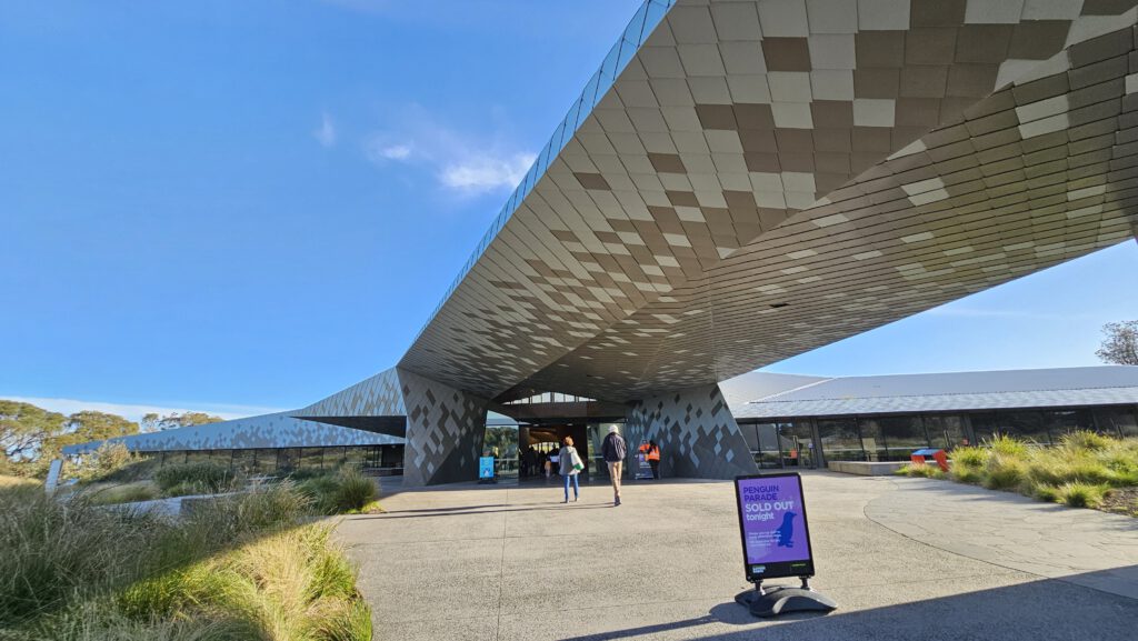Unser letztes Ziel auf dieser Tagestour war die Penguin Parade sowie das dazugehörige Besucherzentrum, Dies ist an sich ein Spektakel ähnlich dem Erlebnis, das wir schon auf Tasmanien hatten, nur in mehrfacher Hinsicht viel größer: Das Gelände hier, über das sich das Nist- und Brutgebiet der Zwergpinguine erstreckt, ist viel ausgedehnter; bedingt dadurch können die Besucher eine viel größere Zahl von Pinguinen beobachten, zugleich ist aber die Zahl der Besucher, die das Spektakel anschauen (hier auf großen Tribünen sitzend) auch bei weitem größer als dort. Gemeinsam ist beiden Erlebnissen, dass das eigentliche Spektakel erst kurz nach Einbruch der Dämmerung beginnt. Aus diesem Grund öffnet das hiesige Besucherzentrum auch erst um 17 Uhr. Als wir auf dem Parkplatz eintrafen, war es aber bereits 18 Uhr.