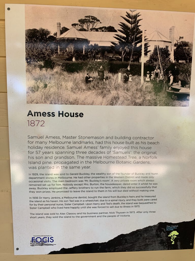 1872 kaufte Samuel Amess, ein bekannter Steinmetz und ehemaliger Bürgermeister von Melbourne, Churchill Island als ländlichen Rückzugsort für seine Familie. Amess errichtete das stattliche Gehöft Amess House (fertiggestellt 1872) und verschiedene Nebengebäude, von denen viele heute noch intakt sind. In der Ära der Familie Amess (bis in die 1920er Jahre) wurde die Insel hauptsächlich als Sommerresidenz und Bauernhof genutzt und von angeheuerten Landarbeitern bewirtschaftet, während die Familie Amess die Insel saisonal besuchte.
